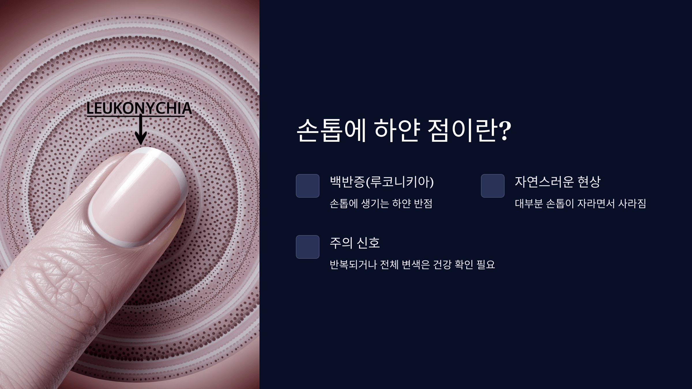 손톱에 생기는 하얀 점은 의학적으로 '백반증(Leukonychia, 루코니키아)'라고 불려요. 이것은 손톱에 미세한 외상이 생기거나, 영양 부족 및 특정 질환의 신호일 수도 있어요. 🤔