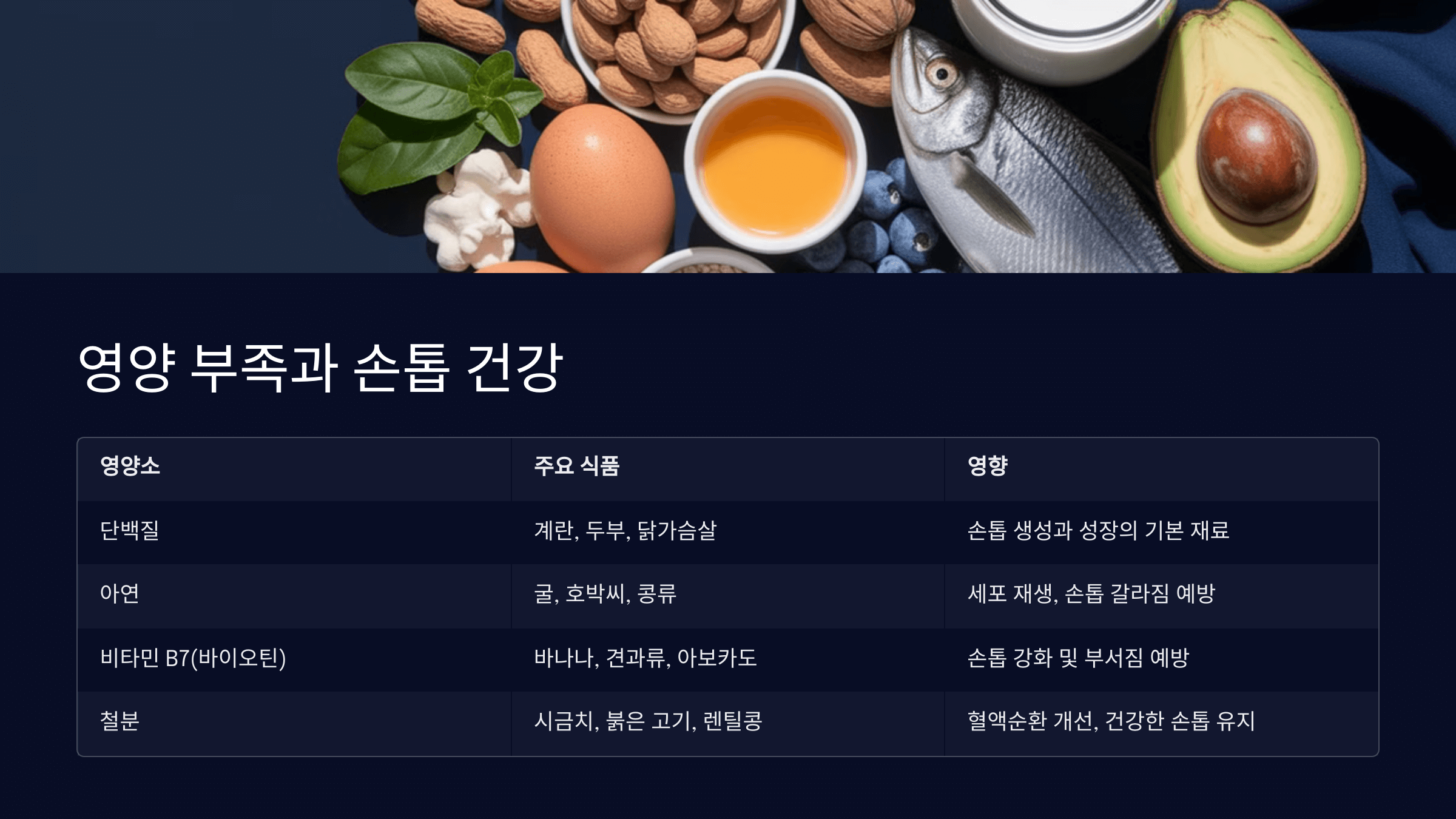 손톱은 단백질로 구성된 케라틴이라는 성분으로 만들어져 있어요. 그래서 영양 상태가 손톱 건강에 직접적으로 영향을 미쳐요. 특히 단백질, 비타민, 미네랄이 부족하면 손톱에 이상 신호가 생길 수 있답니다. 예를 들어 하얀 점, 세로줄, 쉽게 깨지는 손톱 등이 나타날 수 있어요.